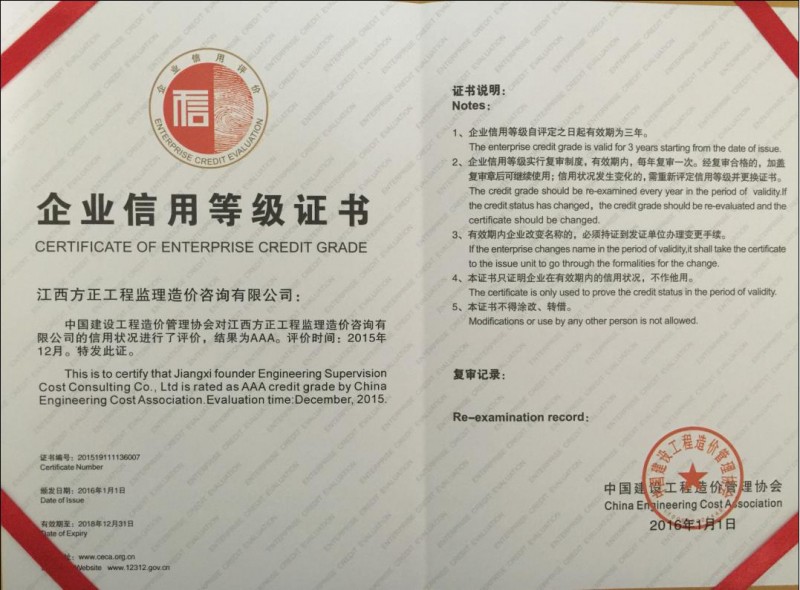 江西方正工程監(jiān)理造價咨詢有限公司于二OO三年五月在南昌市工商行政管理局注冊(注冊號:360100210024211),成立的有限責(zé)任公司,先后取得建設(shè)部及江西省建設(shè)廳頒發(fā)的建設(shè)施工工程造價咨詢企業(yè)資質(zhì)、招投標(biāo)代理機構(gòu)資質(zhì)、工程監(jiān)理資質(zhì)及江西省財政廳頒發(fā)的采購代理資質(zhì),是專門從事工業(yè)與民用建筑工程造價咨詢、工程建設(shè)招投標(biāo)代理、工程監(jiān)理及采購代理的公司。
